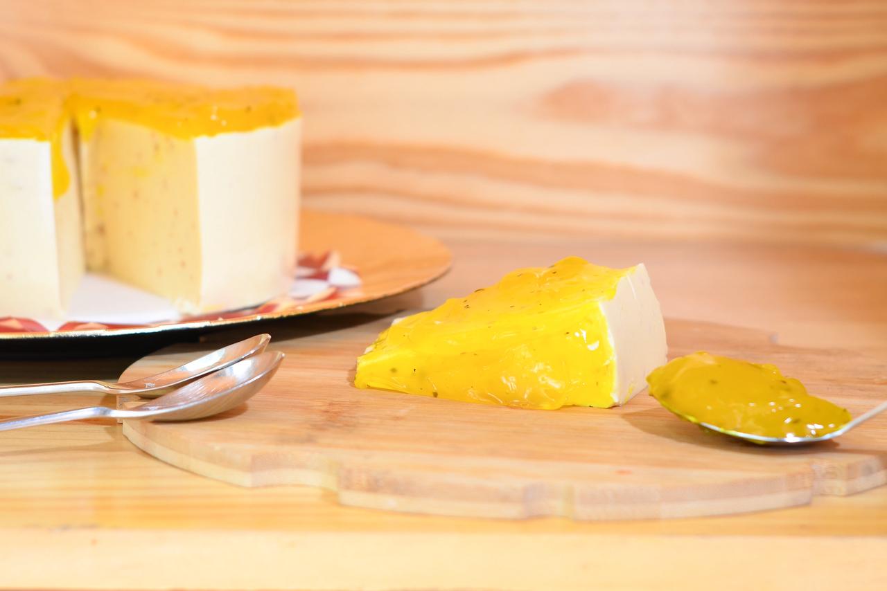 Postre con leche condensada, crema de leche, galletas sultana y pulpa de maracuyá.